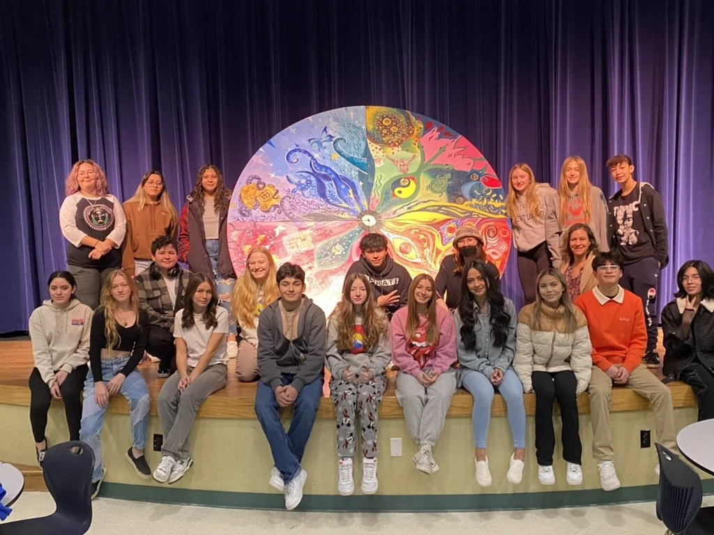 In the 2023 fall “Freedom of Expression'' Art class, one of the projects the Roaring Fork High School students worked on was a class-wide collaborative painting. Keely taught the class with Guinevere Jones. She led this painting, and guided the process as a practice of: letting go of outcome, listening to and trusting our bodies, responding to each other, and strengthening our understanding of color, value, and movement. She vocalized welcoming uncertainty and discomfort. The students were split into four groups and assigned colors to start. Through time, more color mixing occurred, smaller brushes were introduced, and collaging was encouraged. Every student painted. The outcome could not be predicted, and is an expression of relationship.